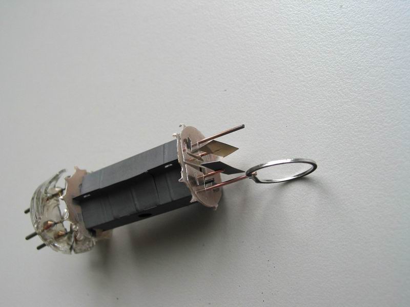 这是颗用于高频放大的通用双三极管6N1。1是吸气剂;2是灯丝阴极和栅极的组合体;3就是阳极。